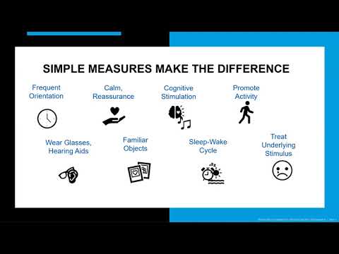 "Hi, its Debbie again, John’s recovery coach. I am going to talk about how to do frequent orientation, also called re-orientation, that is a simple tool that helps prevent delirium and keep the brain healthy. Simple measures like reassurance, conversations, familiar objects, and if your loved ones needs them, wearing glasses and hearing aids, help keep the brain healthy while in the hospital. Did you know that orientation once a hour over 8-hours can prevent delirium? It sure can! It helps the brain stay connected to the current reality or situation. It is easy to get the days and nights confused in the hospital. When I re-orient someone, I put it in a conversation.